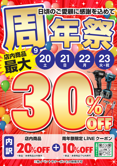 明日からは!待ちに待った! 💥 💥 周 年 祭 💥 💥 が始まりま~す!!! イベント期間は 9/20(土) ~ 9/23(火・祝) までの4日間限定! 気になる内容は… ✅中古品→最大30%OFF! ✅未使用品→最大10%OFF! さらに!特別バージョンのスマイルくじも同時開催★ 1,000円以上のお買上げ or お買取りで、 お会計毎に1回くじが引けます! お得に商品をゲット & 豪華景品が当たるチャンス! 皆様のご来店心よりお待ちしております! また、重量がある大型工具や大量にある場合などは、 【出張買取】にてお伺いさせていただきます。 お電話一本でご予約可能! お近くのドクターツールまで一度お電話ください。