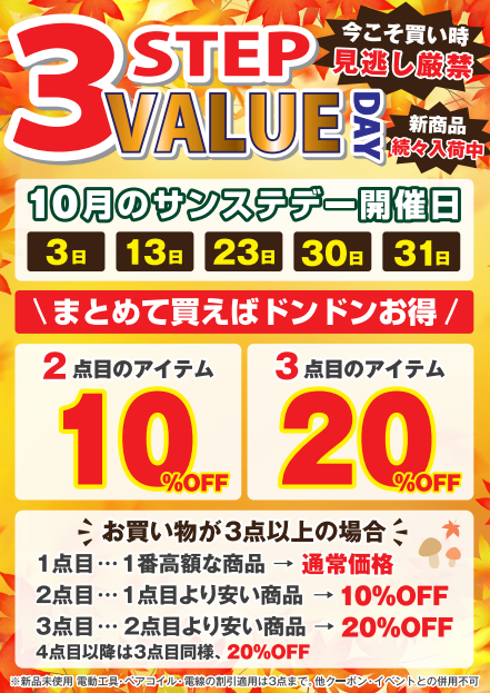 今月も開催します!! 3STEP VALUE DAY 略してサンステデー! 💥毎月3のつく日に開催💥 商品を複数点お買い上げいただくと 2点目は10%OFF、3点目以降は全て20%OFFに! 複数買いが断然オトク🌟 ※新品未使用の電動工具・ペアコイル・電線の割引適用は 1会計につき3点まで この超お得なタイミングにぜひご来店ください♪ 毎月3のつく日は【ドクターツール】へGO! 最大30%OFFのお得なビッグセール 【サン・サタデー】もゲリラ開催します! 開催日は前日にInstagramでお知らせしますのでお見逃しなく!! また、重量がある大型工具や大量にある場合などは、 【出張買取】にてお伺いさせていただきます。 お電話一本でご予約可能! お近くのドクターツールまで一度お電話ください。