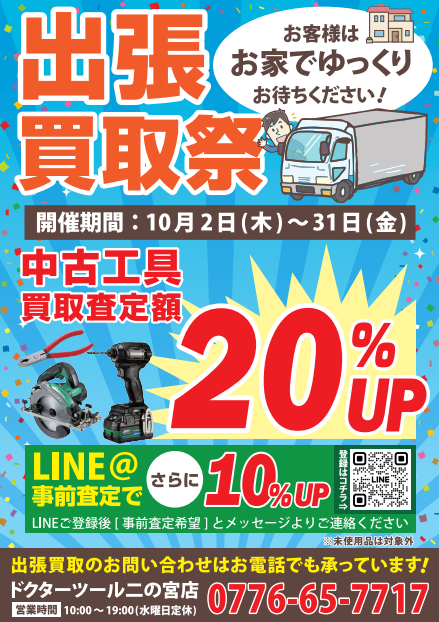 今月は 💥 出張買取祭 💥 を開催します! 期間は 10月2日(木)~10月31日(金) までの約1か月間!! 中古工具の買取金額が20%UP! LINE@の事前査定でさらに10%UP! 買取金額が最大30%UPになる超お得なイベントです☆ お客様はお家でゆっくりお待ちください! お電話やLINE@からご予約可能! お近くのドクターツールまで一度お問い合わせください♪