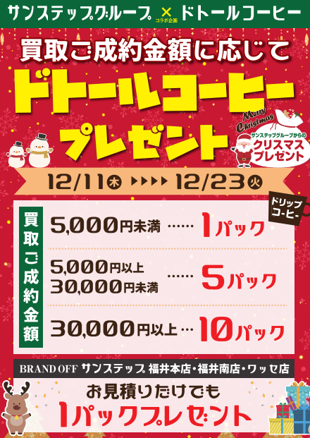 サンステップグループとドトールコーヒーのコラボ企画! 買取ご成約金額に応じて ☕☕☕ドトールコーヒープレゼント☕☕☕ ◎イベント期間 12月11日(木) ~ 12月23日(火) さらに、BRAND OFFではお見積りだけでも 1パックプレゼント! サンステップグループからのクリスマスプレゼント🎁 使わなくなった工具をこの機会にぜひお売りください! また、重量がある大型工具や大量にある場合などは、 【出張買取】にてお伺いさせていただきます。 お電話一本でご予約可能! お近くのドクターツールまで一度お電話ください。
