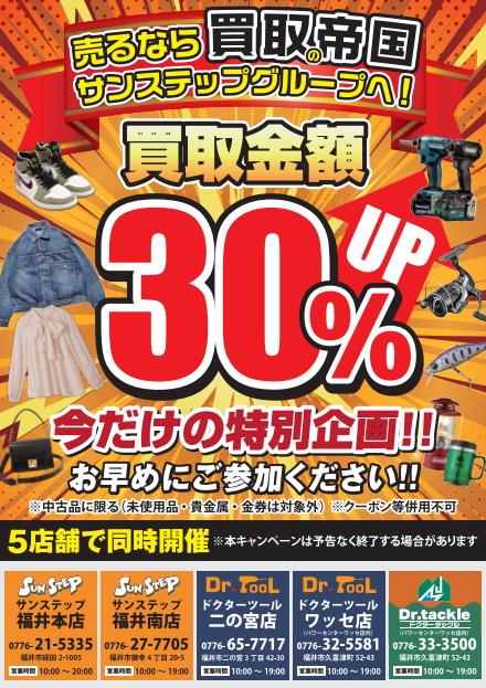💥💥 ただいま買取金額30%UPイベント開催中 💥💥 5店舗で同時開催しております! 売るなら買取の帝国 サンステップグループへ! ※未使用品・貴金属・金券は対象外 今だけの特別企画!! 皆様の買取お持込みお待ちしております🎶 また、重量がある大型工具や大量にある場合などは、 【出張買取】にてお伺いさせていただきます。 お電話一本でご予約可能! お近くのドクターツールまで一度お電話ください。