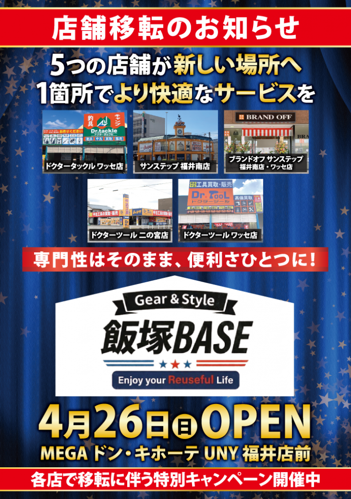 【拡大移転のお知らせ🎉】 この度、拡大移転が決まりました🔥 今回は、ドクターツールだけでなく サンステップ・ドクタータックル・ブランドオフと一緒になり、 今よりも広い店舗として新しく生まれ変わります💪 📍 MEGAドン・キホーテUNY福井店前 📅 4月26日(日)OPEN 売場も広くなり、 さらに見やすく・選びやすいお店になります! そして… 現店舗は【4月12日(日)まで営業】! さらに!! 拡大移転SALEも開催します🔥 お得に買えるチャンスですので、ぜひこの機会にご来店ください!! 現店舗最後の日まで全力で営業します! 新店舗もぜひご期待ください! また、重量がある大型工具や大量にある場合などは、 【出張買取】にてお伺いさせていただきます。 お電話一本でご予約可能! お近くのドクターツールまで一度お電話ください。